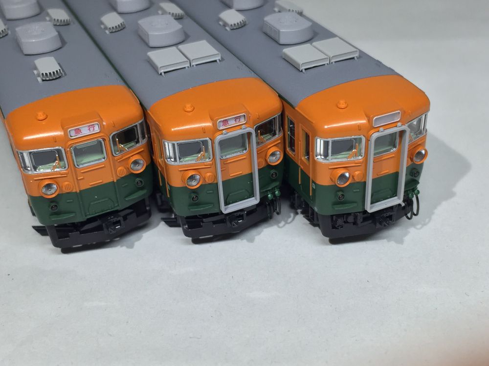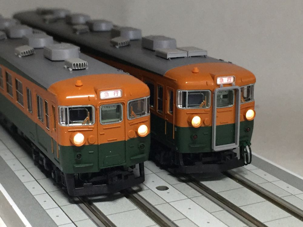 左のクハ165と中のクモハ165のヘッドライトの印象が変わりました。今回の目的に近づけたかな(;^_^A