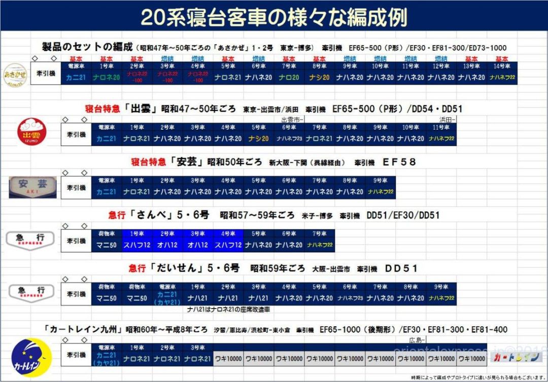 これを見るとどれも再現してみたくなりますね。今回のカートレインは一番下の編成に近いものです。
