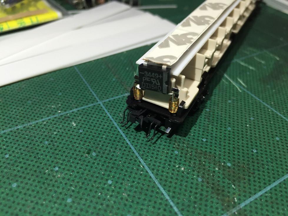 ブリッジダイオードの足にスプリングを1/4にカットしたものを集電用金具に差し込みます。