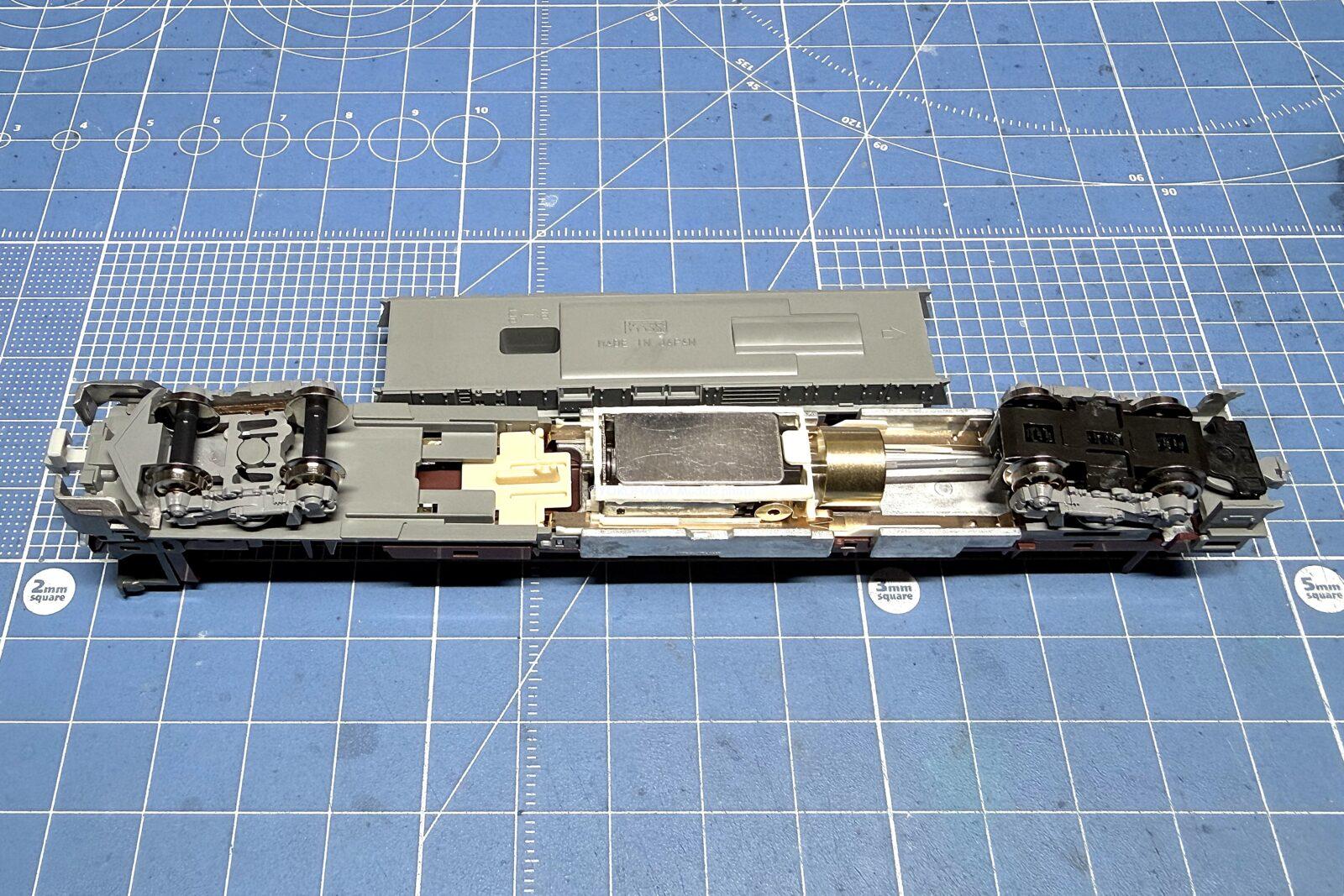 ライトスイッチは床下のモーターカバーを取外すと隠されていますが、外さなくてもON-OFFできます。0.5Mと言われちゃってる動力ユニットです。小さいフライホールが片側だけに付いてますので、フライホールの恩恵はあまり感じないです。モーターはスロットレスモーター(SL-3)採用で、モーターに減磁板が取付けられています。