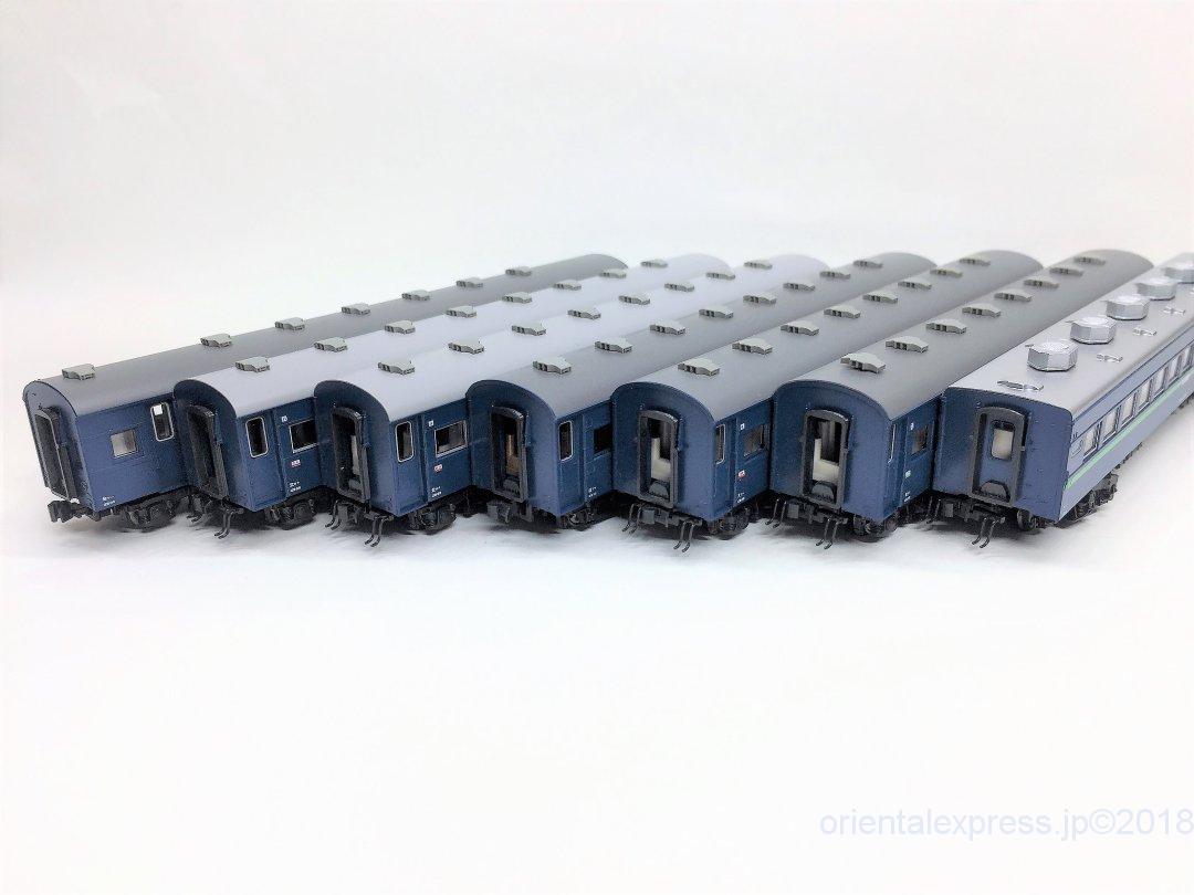 先ずはカプラーがあべこべですので統一します。ちょうど台車の再生産がありましたので、台車ごと入れ替えてバージョンアップしちゃいます。ことらはオハネフ12です。