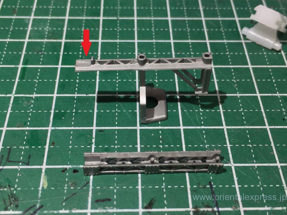 そこで、架線柱台の矢印の部分にGクリヤーを塗って組み立てました。