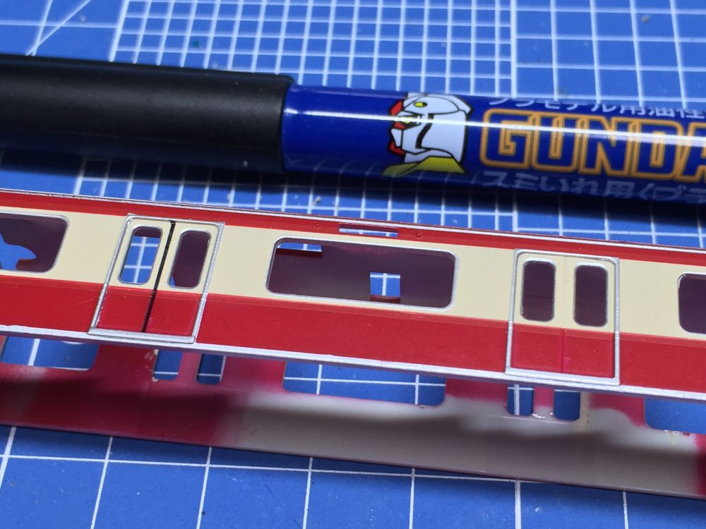 ガンダムマーカー スミ入れ用(ブラック)極細です。これで溝をなぞればそれらしく見える?少し太いかな。