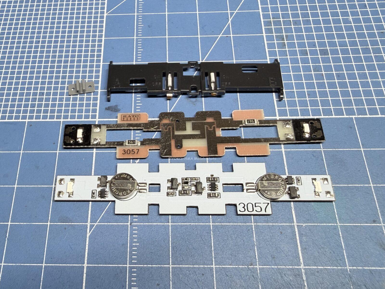 切り欠き部分が合わないので、ちょっと基板が浮いている状態です。ですが集電は出来ているので・・・私は加工して純正と同じような所に収めました。