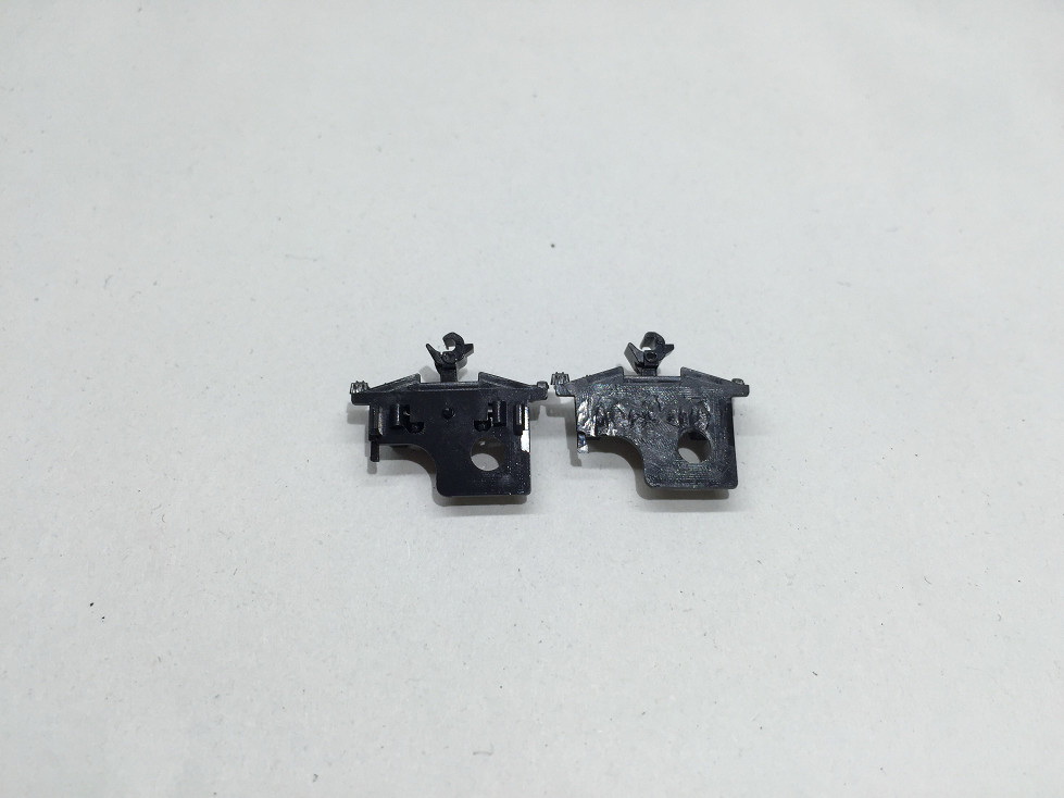 前面側はすこし加工して取り付けました。EF66用のナックルカプラーだと幌を取り付けると少し短く、その上のナックルカプラーにすると少し長いんですよね。そこでうでが長い方を使って元の穴の上に別の穴を開けてみました。