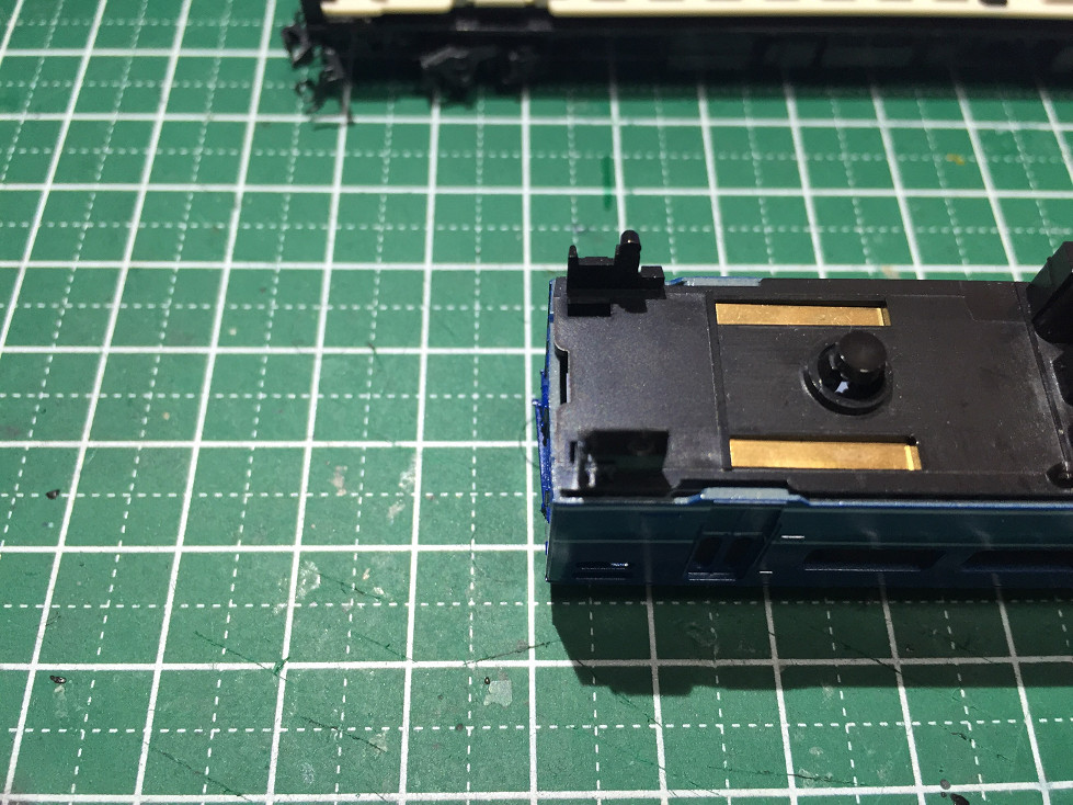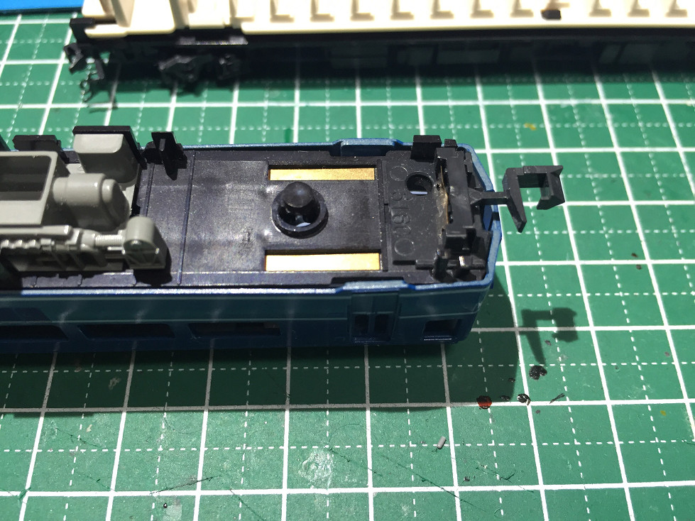 アダプタに差し込んでみます。そのままだと板バネが取り付けできないので、ナックルカプラーの出っ張りをカットしました。