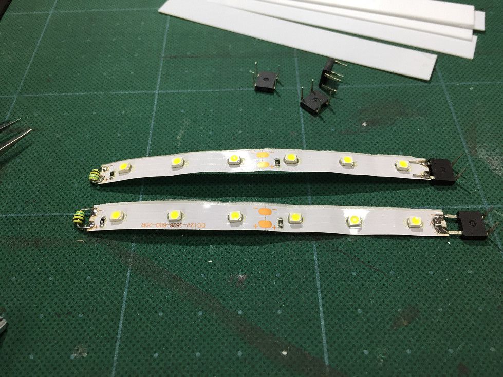 LEDテープにセラミックコンデンサ、ブリッジダイオード、集電金具に集電スプリングとプラバン2mm厚を用意しました。