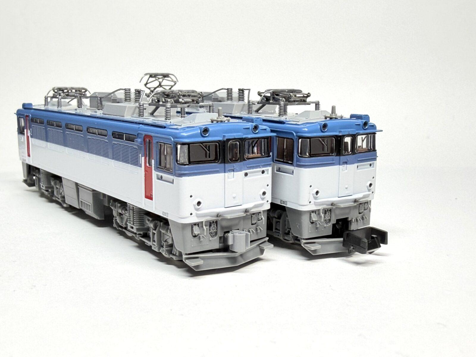 左が前回品の9116 ED79です。塗装は中国か日本かの違いもありますが、どちらも良い感じです。左側の方がマスキングが弱いのか白が少しブルーの方に被っているくらいで。