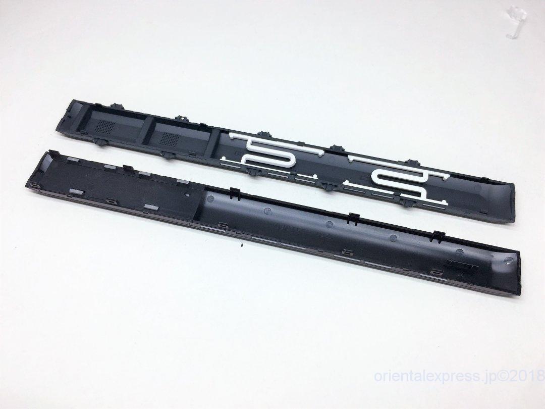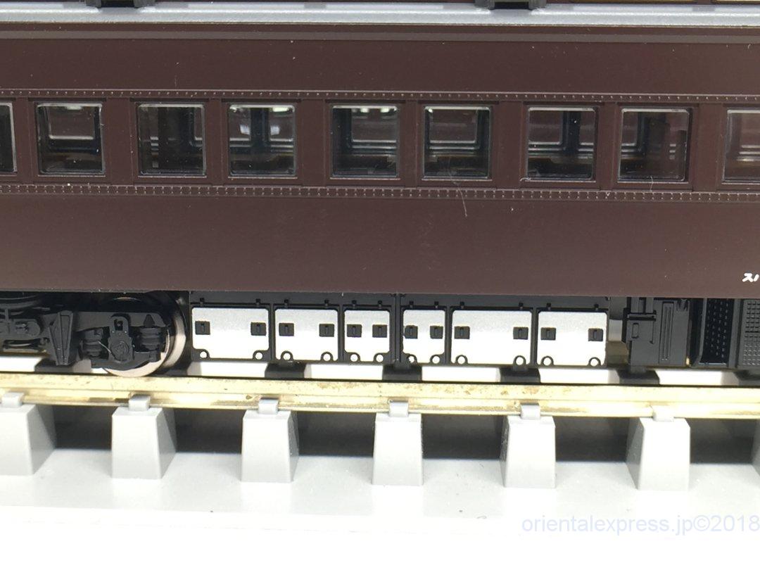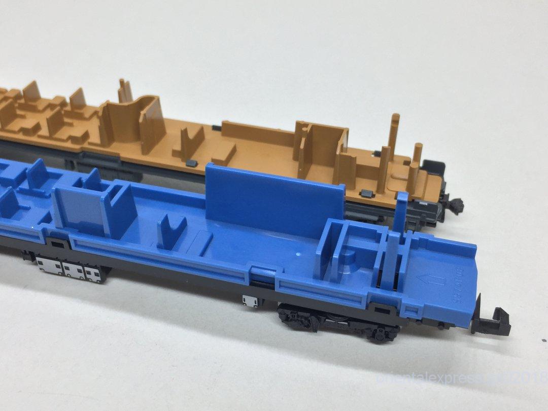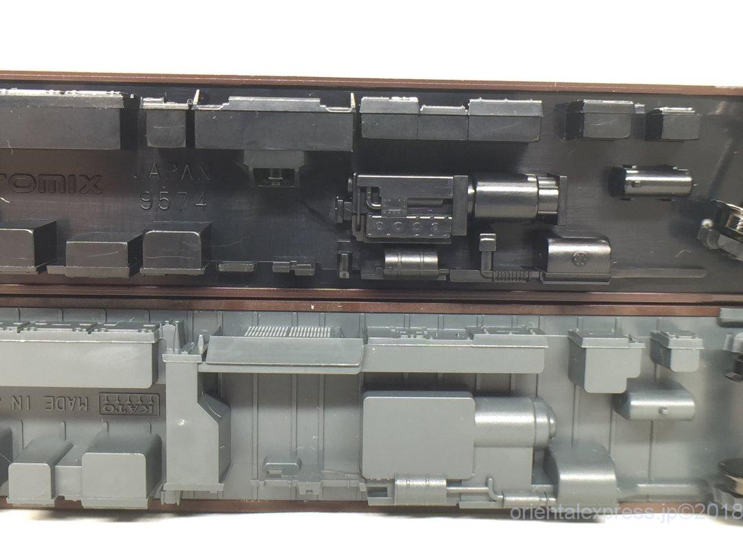 手前がTOMIX製品、奥がKATO製品です。TOMIX製品は車端部床下がスカスカですね。標記類も印刷がありません。かと言ってインレタが付属しているわけでも無いのでここはサードパーティー製に頼るところです。筆者はほぼ張り付けませんのでどちらでも使える二刀流です(;^_^A