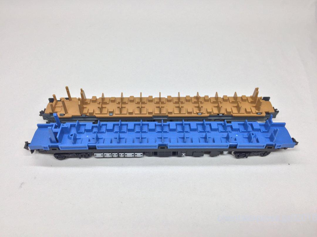 こちらはナハ35 4001の床下セットです。青色がTOMIXで茶色がKATOになります。ブラインドで見えないところですが、それなりに作られているTOMIXか良い具合にデフォルメされているKATOかはわかれるところですね。