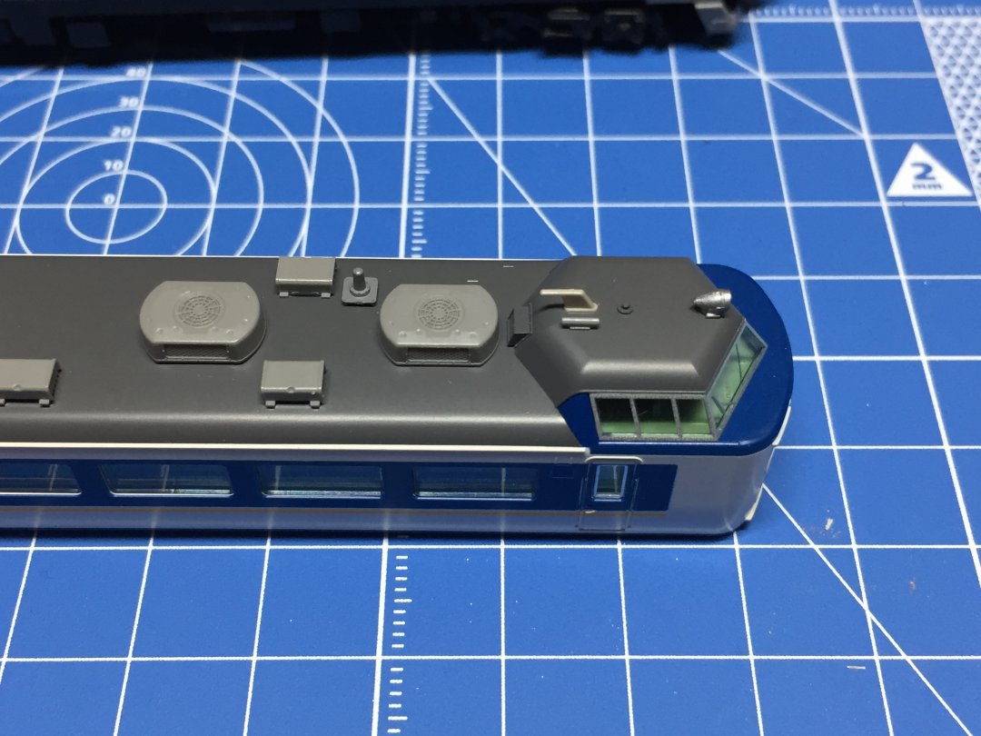 検電アンテナ、列車無線アンテナを取付けますが、列車無線アンテナはKATOのAssyパーツを差し込んだだけです。0.6㎜で穴を大きくすると入れやすいです。見慣れた無線アンテナになりました。