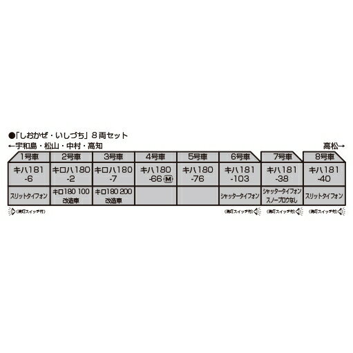 | キハ181-6 | キロハ180-2 | キロハ180-7(M) | キハ180-66(M) | キハ180-76 | キハ181-103 | キハ181-38 | キハ181-40 |
