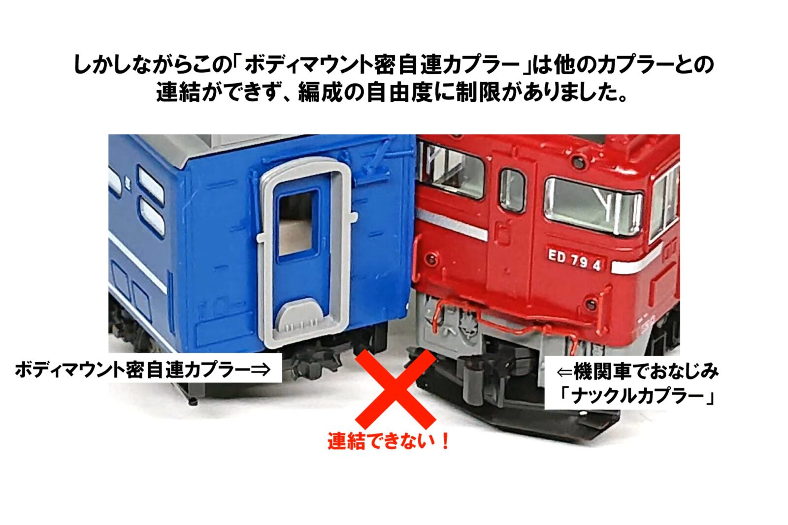 中間連結面の「ボディマウント密自連カプラー」を「ボディマウントナックルカプラー」に交換することで、訓練列車や回送列車の様子を再現できます。