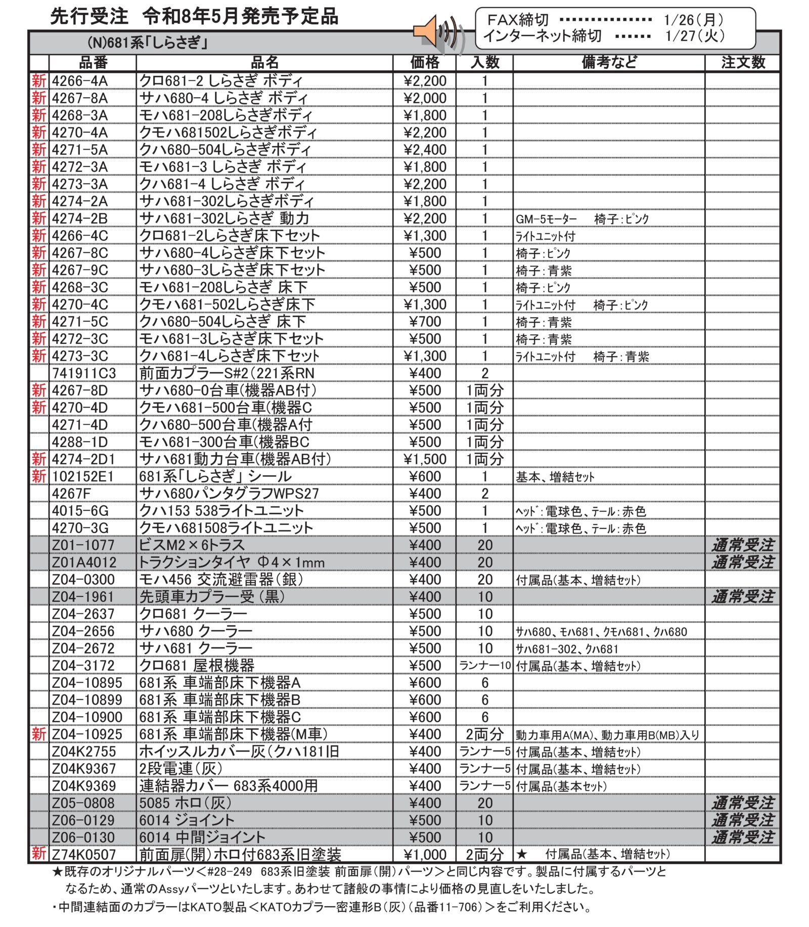 | 新 | Z74K0507 | 前面扉(開)ホロ付683系旧塗装 | 1,100円 |