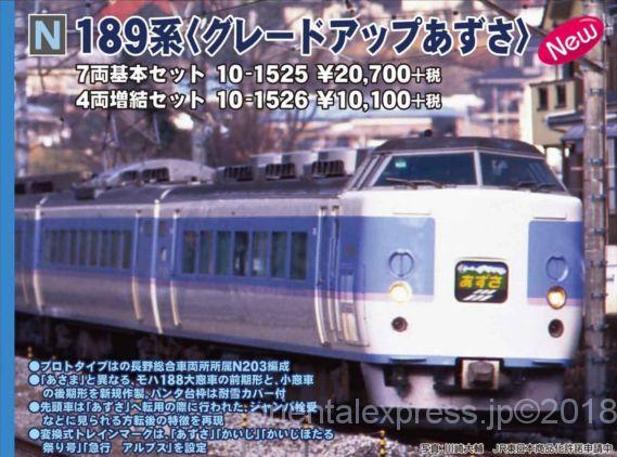 –品番 品名 価格(税別) [新] 10-1525 189系<グレードアップあずさ>7両基本セット 20700円 [新] 10-1526 189系<グレードアップあずさ>4両増結セット 10100円 インフォメーション