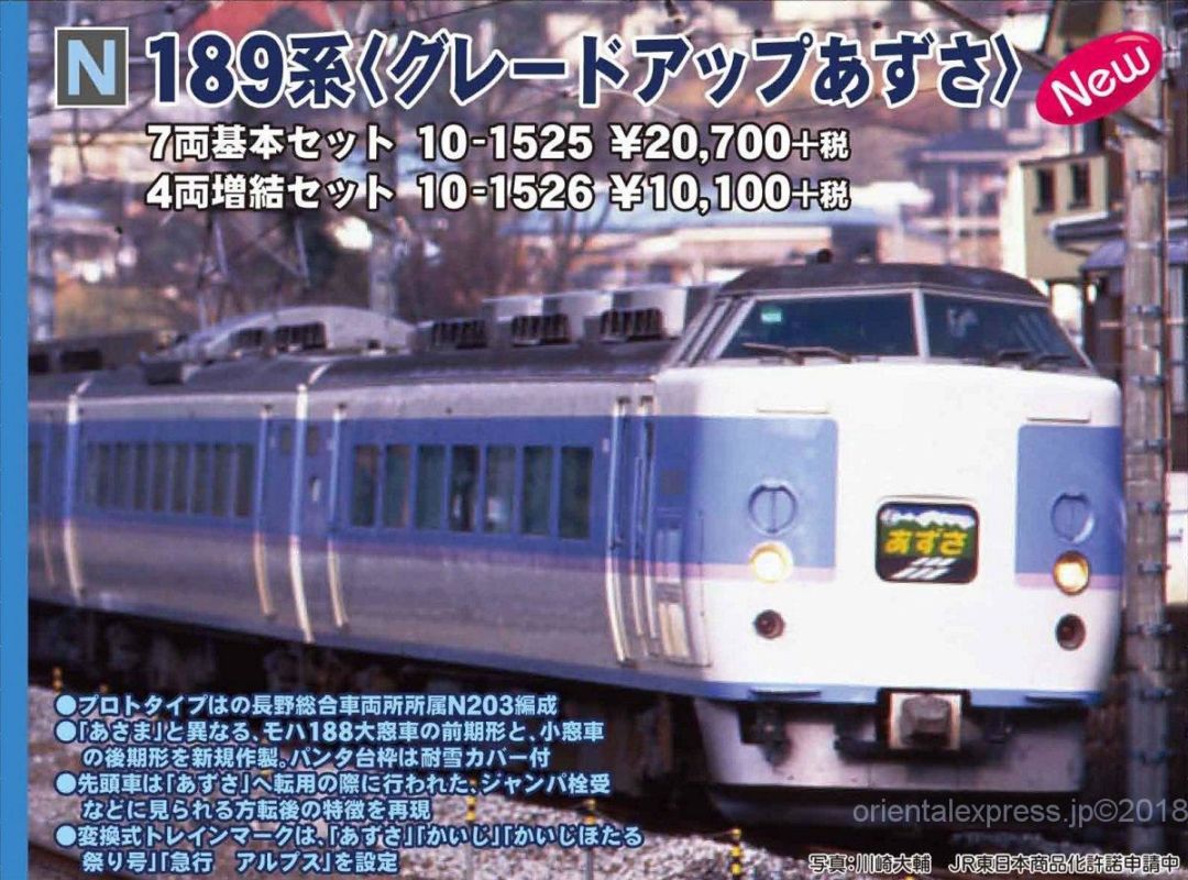 –品番 品名 価格(税別) [新] 10-1525 189系<グレードアップあずさ>7両基本セット 20700円 [新] 10-1526 189系<グレードアップあずさ>4両増結セット 10100円 インフォメーション