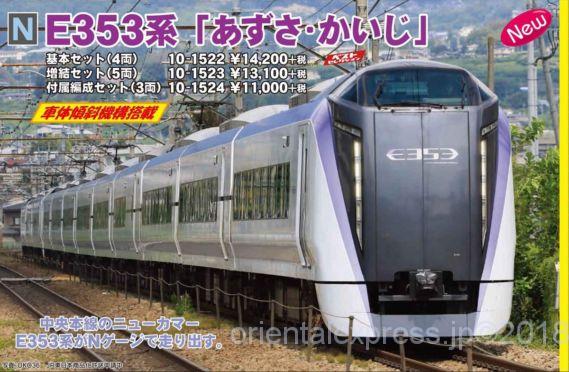 –品番 品名 価格(税別) [新] 10-1522 E353系「あずさ・かいじ」基本セット(4両) 14200円 [新] 10-1523 E353系「あずさ・かいじ」増結セット(5両) 13100円 [新] 10-1524 E353系「あずさ・かいじ」付属編成セット(3両) 11000円 インフォメーション
