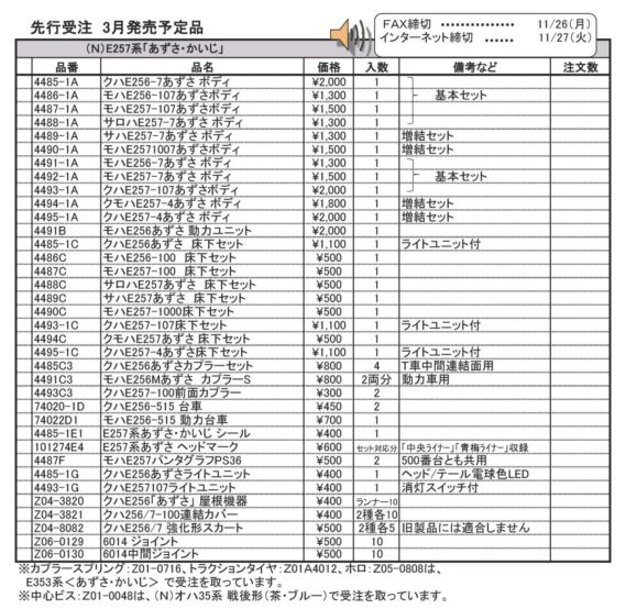 品番 品名 価格 入数 備考 [再] 4485-1A クハE256-7あずさ ボディ 2000円 1 [再] 4486-1A モハE256-107あずさボディ 1300円 1 基本セット [再] 4487-1A モハE257-107あずさボディ 1500円 1 [再] 4488-1A サロハE257-7あずさ ボディ 1300円 1 [再] 4489-1A サハE257-7あずさ ボディ 1300円 1 増結セット [再] 4490-1A モハE2571007あずさボディ 1500円 1 増結セット [再] 4491-1A モハE256-7あずさ ボディ 1300円 1 [再] 4492-1A モハE257-7あずさ ボディ 1500円 1 基本セット [再] 4493-1A クハE257-107あずさボディ 2000円 1 [再] 4494-1A クモハE257-4あずさ ボディ 1800円 1 増結セット [再] 4495-1A クハE257-4あずさ ボディ 2000円 1 増結セット [再] 4491B モハE256あずさ 動力ユニット 2000円 1 [再] 4485-1C クハE256あずさ 床下セット 1100円 1 ライトユニット付 [再] 4486C モハE256-100 床下セット 500円 1 [再] 4487C モハE257-100 床下セット 500円 1 [再] 4488C サロハE257あずさ 床下セット 500円 1 [再] 4489C サハE257あずさ 床下セット 500円 1 [再] 4490C モハE257-1000床下セット 500円 1 [再] 4493-1C クハE257-107床下セット 1100円 1 ライトユニット付 [再] 4494C クモハE257あずさ 床下セット 500円 1 [再] 4495-1C クハE257-4あずさ床下セット 1100円 1 ライトユニット付 [再] 4485C3 クハE256あずさカプラーセット 800円 4 T車中間連結面用 [再] 4491C3 モハE256Mあずさ カプラーS 800円 2両分 動力車用 [再] 4493C3 クハE257-100前面カプラー 300円 2 [再] 74020-1D クハE256-515 台車 450円 2 [再] 74022D1 モハE256-515 動力台車 700円 1 [再] 4485-1E1 E257系あずさ・かいじ シール 400円 1 [再] 101274E4 E257系あずさ ヘッドマーク 600円 セット対応分 「中央ライナー」「青梅ライナー」収録 [再] 4487F モハE257パンタグラフPS36 500円 2 500番台とも共用 [再] 4485-1G クハE256あずさライトユニット 400円 1 ヘッド/テール電球色LED [再] 4493-1G クハE257107ライトユニット 400円 1 消灯スイッチ付 [再] Z04-3820 クハE256「あずさ」 屋根機器 400円 ランナー10 [再] Z04-3821 クハ256/7-100連結カバー 400円 2種各10 [再] Z04-8082 クハE256/7 強化形スカート 500円 2種各5 旧製品には適合しません [再] Z06-0129 6014 ジョイント 500円 10 [再] Z06-0130 6014中間ジョイント 500円 10 - クリックでオープン&クローズ