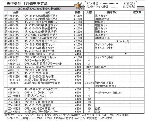 品番 品名 価格 入数 備考 [新] 4788-2A クハ312-5009快速ボディ 1800円 1 基本セット [新] 4788-3A クハ312-5021快速ボディ 1800円 1 2両増結セット [新] 4789-2A モハ313-5309快速ボディ 1500円 1 増結セット [新] 4790-2A サハ313-5009快速ボディ 1500円 1 増結セット [新] 4791-2A モハ313-5009快速ボディ 1500円 1 基本セット [新] 4792-2A サハ313-5309快速ボディ 1500円 1 増結セット [新] 4793-2A クモハ313-5009快ボディ 1800円 1 基本セット [新] 4793-3A クモハ313-5304快ボディ 1800円 1 2両増結セット [新] 4791-2B モハ313-5009動力ユニット 2600円 1 ダンパー付 [新] 4788-2C クハ312-5009 床下セット 1000円 1 ライトユニット付 [新] 4788-3C クハ312-5021 床下セット 1000円 1 ライトユニット付 [新] 4789-2C モハ313-5309 床下セット 450円 1 [新] 4790-2C サハ313-5009 床下セット 450円 1 [新] 4793-2C クモハ313-5009床下セット 1000円 1 ライトユニット付 [再] 4470C3 カプラーセット 灰(T) 800円 4 [再] 4785-1C3 クモハ383前面用カプラーセット 300円 2 先頭車前面用 [再] 4791-1C3 モハ313-5000カプラセット 400円 1両分 モハ313(動力車)用 [再] 4788-1D クハ313-5000 台車 450円 2 [再] 4789-1D モハ313-5300 台車 450円 2 [再] 47911ZD1 モハ313-5000 動力台車 700円 1 [再] 741111E1 313系0番台 優先席シール 700円 1 [再] 10586E4 313系5000番台前面行先表示 600円 セット対応分 「快速大垣」「特別快速豊橋」 [再] 4371F モハネ285ー201パンタグラフ 500円 2 [再] 4595-1G クモハ101 ライトユニット 600円 1 テール/ヘッド:白色 [再] Z01-0384 中間ジョイントL21 400円 4 [再] Z04-3673 313 スカート 400円 10 [再] Z04-5407 クハ312-5000 信号炎管 400円 20 [再] Z04-5418 モハ313-5300 避雷器 400円 20 [再] Z04-5428 クモハ313-5000 前面ホロ 300円 10 [新] Z04K5589 313系5000 車体間ダンパー 400円 5 灰色 - クリックでオープン&クローズ