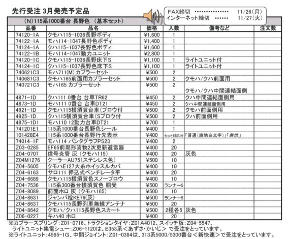 品番 品名 価格 入数 備考 [再] 74120-1A クモハ115-1036長野ボディ 1600円 1 [再] 74122-1A モハ114-1047長野色ボディ 1400円 1 [再] 74124-1A クハ115-1037長野色ボディ 1600円 1 [再] 74122-1B モハ114-1047動力ユニット 2800円 1 [再] 74120-1C クモハ115-1036長野床下S 1100円 1 ライトユニット付 [再] 74124-1C クハ115-1037長野色床下S 1100円 1 ライトユニット付 [再] 740621C3 モハ711(M) カプラーセット 500円 2 [再] 740681C3 クモハ165前面用カプラーセット 500円 2 [再] 740721C3 モハ165 カプラーセット 500円 2 [再] 4871-1D クハ111 0番台 台車TR62 450円 2 [再] 4873-1D モハ11 0番台 台車DT21 450円 2 [再] 4921-1D クモハ115横須賀台車(プロウ付 500円 2 クモハ前面側用 [再] 4925-1D クハ115横須賀台車(Sプロウ付 500円 2 [再] 4875-1D1 モハ110 12動力台車DT21 700円 1 トラクションタイヤ付 [再] 741201E1 115系1000番台長野色シール 400円 1 [再] 101428E4 115系1000番台長野行先表示 400円 セット対応分 「普通(紺地白文字)」「無地」 [再] 74014-1F モハ114 パンタグラフPS23 400円 2 [再] Z03-0285 EF65前期形貨物2次更新 避雷器 400円 20 [再] Z04-0707 信号炎管 灰 (クモハ115) 400円 20 [再] Z04M1276 クーラーAU75(ステンレス色) 500円 10 [再] Z04-5605 クモハE127大糸ホイッスルカバ 400円 10 [再] Z04-6163 サロ111 押込式ベンチレータ平 400円 20 [再] Z04-6689 クモハ115横須賀色スノープロウ 400円 10 [再] Z04-7536 115系300番台横須賀色 胴受 500円 ランナー5 [再] Z04-8089 前面ホロ 灰 (クモハ165) 500円 10 [再] Z04-8631 ジャンパ栓KE76(灰) 500円 ランナー5 [再] Z04-8637 クモハ115長野列車無線アンテナ 500円 20 [再] Z04-8642 クモハ/クハ115長野色スカート 500円 2種各5 灰色 [再] Z06-0227 キハ40 ホロ 400円 20 - クリックでオープン&クローズ