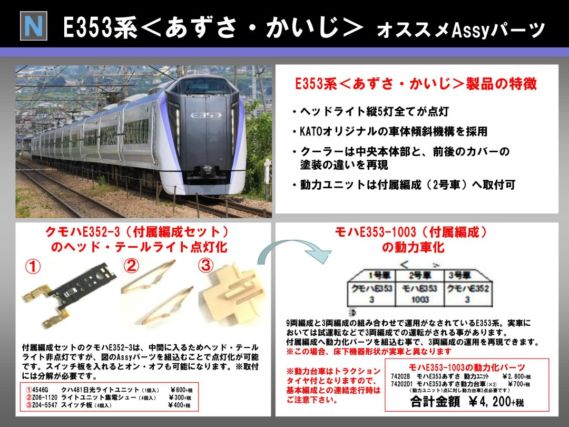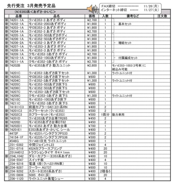 | [新] | 74202B | モハE353あずさ 動力ユニット | 2800円 | 1 | モハE353-1003(2号車)に組込み可能 |