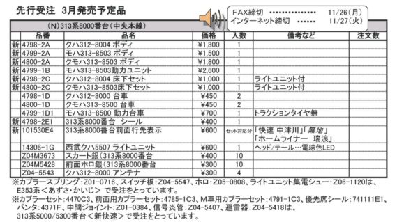 品番 品名 価格 入数 備考 [新] 4798-2A クハ312-8004 ボディ 1800円 1 [新] 4799-2A モハ313-8503 ボディ 1500円 1 [新] 4800-2A クモハ313-8503 ボディ 1800円 1 [新] 4799-1B モハ313-8503動力ユニット 2600円 1 [新] 4798-2C クハ312-8004 床下セット 1000円 1 ライトユニット付 [新] 4800-2C クモハ313-8503床下セット 1000円 1 ライトユニット付 [再] 4798-1D クハ312-8000 台車 400円 2 [再] 4800-1D クモハ313-8500 台車 450円 2 [再] 4799-1D1 モハ313-8500 動力台車 700円 1 トラクションタイヤ無 [新] 4798-2E1 313系8000番台 シール 400円 1 [新] 101530E4 313系8000番台前面行先表示 600円 セット対応分 「快速中津川」「無地」「ホームライナー 瑞浪」 [再] 14306-1G 西武クハ5507 ライトユニット 600円 1 ヘッド/テール:電球色 [再] Z04M3673 スカート銀(313系8000番台 400円 10 [再] Z04M5428 前面ホロ銀(313系8000番台 300円 10 [再] Z04-5543 クハ312-8000 アンテナ 300円 4 - クリックでオープン&クローズ
