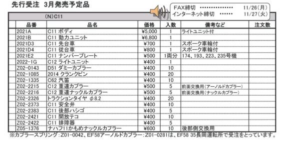 品番 品名 価格 入数 備考 [再] 2021A C11 ボディ 5000円 1 ライトユニット付 [再] 2021B C11 動力ユニット 6800円 1 [再] 2021D3 C11 先台車 700円 1 スポーク車輪付 [再] 2021D4 C11 従台車 800円 1 スポーク車輪付 [再] 2021E2 C11 ナンバープレート 500円 1両分174、193、223、235号機 [再] 2022-1G C12 ライトユニット 400円 1 [再] Z02-0143 D51 ダミーカラプラー 400円 10 [再] Z02-1085 2014 クランクピン 400円 20 [再] Z02-1335 C62 汽笛 400円 10 [再] Z02-2215 C12 重連カプラー 500円 5 前面交換用(アーノルドカプラー) [再] Z02-2216 C12 重連ナックルカプラー 500円 5 前面交換用(ナックルカプラー) [再] Z02-2326 トラクションタイヤ φ8.2 400円 20 [再] Z02-2373 C11 安全弁 400円 10 [再] Z02-2383 C11 後部ハシゴ 400円 5 [再] Z02-2421 C11 開放テコ 400円 10 [再] Z02-2422 C11 排障器 400円 5 [再] Z05-1376 ナハフ11かもめナックルカプラー 600円 10 - クリックでオープン&クローズ