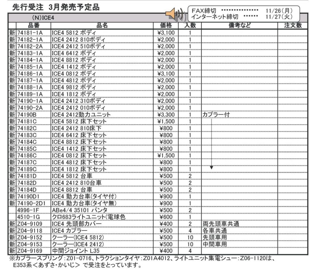 品番 品名 価格 入数 備考 [新] 74182-1A ICE4 2412 810ボディ 2000円 1 [新] 74182-2A ICE4 2412 510ボディ 2000円 1 [新] 74183-1A ICE4 6412 ボディ 2000円 1 [新] 74184-1A ICE4 8812 ボディ 2000円 1 [新] 74185-1A ICE4 1412 ボディ 2000円 1 [新] 74186-1A ICE4 0812 ボディ 3100円 1 [新] 74187-1A ICE4 4812 ボディ 2000円 1 [新] 74188-1A ICE4 9812 ボディ 2000円 1 [新] 74189-1A ICE4 1812 ボディ 2000円 1 [新] 74190-1A ICE4 2412 310ボディ 2000円 1 [新] 74190-2A ICE4 2412 010ボディ 2000円 1 [新] 74190B ICE4 2412 動力ユニット 3300円 1 カプラー付 [新] 74181C ICE4 5812 床下セット 1500円 1 [新] 74182C ICE4 2412 810床下 800円 1 [新] 74183C ICE4 6412 床下セット 800円 1 [新] 74184C ICE4 8812 床下セット 800円 1 [新] 74185C ICE4 1412 床下セット 800円 1 [新] 74186C ICE4 0812 床下セット 1500円 1 [新] 74187C ICE4 4812 床下セット 800円 1 [新] 74189C ICE4 1812 床下セット 800円 1 [新] 74181D ICE4 5812 台車 500円 2 [新] 74182D ICE4 2412 810台車 500円 2 [新] 74184D ICE4 8812 台車 500円 2 [新] 74190D1 ICE4 動力台車(タイヤ付) 900円 1 [新] 74190-2D1 ICE4 動力台車(タイヤ無) 900円 1 [再] 4996-1F ABe4/4 35101パンタ 500円 2 [再] 4510-1G クロ683ライトユニット(電球色 600円 1 [新] Z04-9109 ICE4 先頭部カバー 400円 2 両先頭車共通 [新] Z04-9118 ICE4 カプラー 500円 4 各車共通 [新] Z04-9152 クーラー(ICE4 5812) 500円 10 先頭車用 [新] Z04-9153 クーラー(ICE4 2412) 500円 10 中間車用 [新] Z04-9169 中間ジョイント L35 400円 4 - クリックでオープン&クローズ