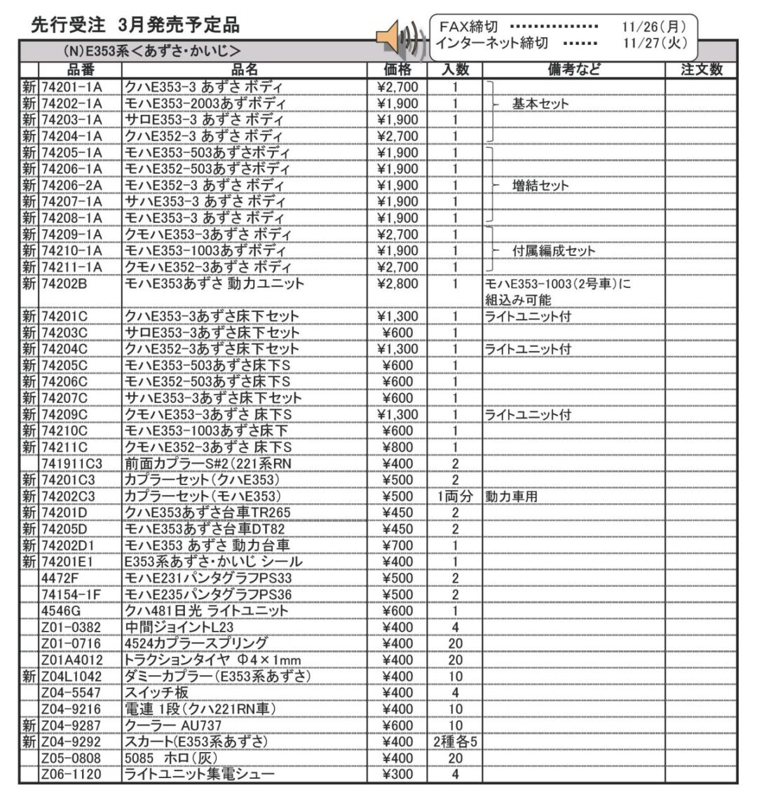 品番 品名 価格 入数 備考 [新] 74201-1A クハE353-3 あずさ ボディ 2700円 1 [新] 74202-1A モハE353-2003あずボディ 1900円 1 基本セット [新] 74203-1A サロE353-3 あずさ ボディ 1900円 1 [新] 74204-1A クハE352-3 あずさ ボディ 2700円 1 [新] 74205-1A モハE353-503あずさボディ 1900円 1 [新] 74206-1A モハE352-503あずさボディ 1900円 1 [新] 74206-2A モハE352-3 あずさ ボディ 1900円 1 増結セット [新] 74207-1A サハE353-3 あずさ ボディ 1900円 1 [新] 74208-1A モハE353-3 あずさ ボディ 1900円 1 [新] 74209-1A クモハE353-3あずさ ボディ 2700円 1 [新] 74210-1A モハE353-1003あずボディ 1900円 1 付属編成セット [新] 74211-1A クモハE352-3あずさ ボディ 2700円 1 [新] 74202B モハE353あずさ 動力ユニット 2800円 1 モハE353-1003(2号車)に組込み可能 [新] 74201C クハE353-3あずさ床下セット 1300円 1 ライトユニット付 [新] 74203C サロE353-3あずさ床下セット 600円 1 [新] 74204C クハE352-3あずさ床下セット 1300円 1 ライトユニット付 [新] 74205C モハE353-503あずさ床下S 600円 1 [新] 74206C モハE352-503あずさ床下S 600円 1 [新] 74207C サハE353-3あずさ床下セット 600円 1 [新] 74209C クモハE353-3あずさ 床下S 1300円 1 ライトユニット付 [新] 74210C モハE353-1003あずさ床下 600円 1 [新] 74211C クモハE352-3あずさ 床下S 800円 1 [新] 741911C3 前面カプラーS#2(221系RN 400円 2 前面用(フック無) [新] 74201C3 カプラーセット(クハE353) 500円 2 [新] 74202C3 カプラーセット(モハE353) 500円 1両分 動力車用 [新] 74201D クハE353あずさ台車TR265 450円 2 [新] 74205D モハE353あずさ台車DT82 450円 2 [新] 74202D1 モハE353 あずさ 動力台車 700円 1 [新] 74201E1 E353系あずさ・かいじ シール 400円 1 [再] 4472F モハE231パンタグラフPS33 500円 2 [再] 74154-1F モハE235パンタグラフPS36 500円 2 [新] 4546G クハ481日光 ライトユニット 600円 1 [再] Z01-0382 中間ジョイントL23 400円 4 [再] Z01-0716 4524カプラースプリング 400円 20 [再] Z01A4012 トラクションタイヤΦ4×1mm 400円 20 [新] Z04L1042 ダミーカプラー(E353系あずさ) 400円 10 [再] Z04-5547 スイッチ板 400円 4 [新] Z04-9216 電連 1段(クハ221RN車) 400円 10 [新] Z04-9287 クーラー AU737 600円 10 [新] Z04-9292 スカート(E353系あずさ) 400円 2種各5 [再] Z05-0808 5085 ホロ(灰) 400円 20 [再] Z06-1120 ライトユニット集電シュー 300円 4 - クリックでオープン&クローズ