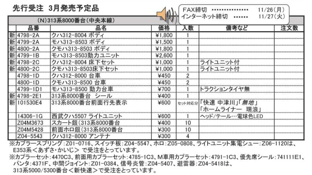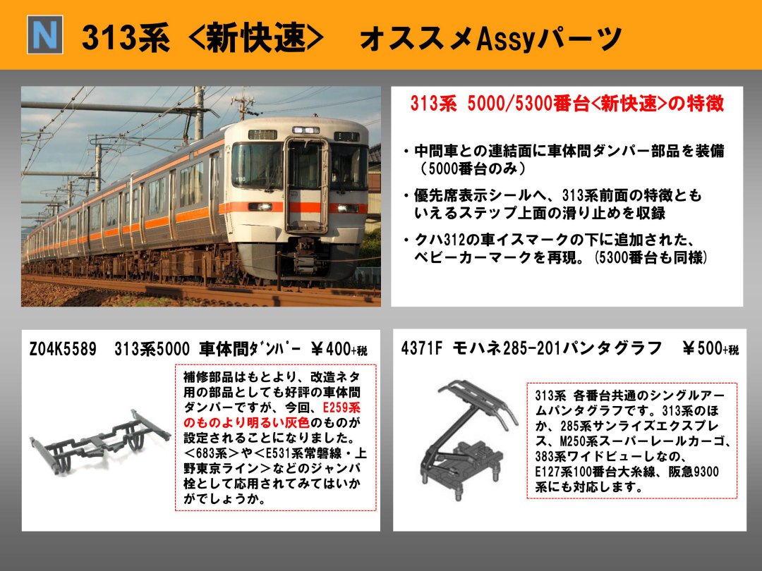 品番 品名 価格 入数 備考 [新] 4788-2A クハ312-5009快速ボディ 1800円 1 基本セット [新] 4788-3A クハ312-5021快速ボディ 1800円 1 2両増結セット [新] 4789-2A モハ313-5309快速ボディ 1500円 1 増結セット [新] 4790-2A サハ313-5009快速ボディ 1500円 1 増結セット [新] 4791-2A モハ313-5009快速ボディ 1500円 1 基本セット [新] 4792-2A サハ313-5309快速ボディ 1500円 1 増結セット [新] 4793-2A クモハ313-5009快ボディ 1800円 1 基本セット [新] 4793-3A クモハ313-5304快ボディ 1800円 1 2両増結セット [新] 4791-2B モハ313-5009動力ユニット 2600円 1 ダンパー付 [新] 4788-2C クハ312-5009 床下セット 1000円 1 ライトユニット付 [新] 4788-3C クハ312-5021 床下セット 1000円 1 ライトユニット付 [新] 4789-2C モハ313-5309 床下セット 450円 1 [新] 4790-2C サハ313-5009 床下セット 450円 1 [新] 4793-2C クモハ313-5009床下セット 1000円 1 ライトユニット付 [再] 4470C3 カプラーセット 灰(T) 800円 4 [再] 4785-1C3 クモハ383前面用カプラーセット 300円 2 先頭車前面用 [再] 4791-1C3 モハ313-5000カプラセット 400円 1両分 モハ313(動力車)用 [再] 4788-1D クハ313-5000 台車 450円 2 [再] 4789-1D モハ313-5300 台車 450円 2 [再] 47911ZD1 モハ313-5000 動力台車 700円 1 [再] 741111E1 313系0番台 優先席シール 700円 1 [再] 10586E4 313系5000番台前面行先表示 600円 セット対応分 「快速大垣」「特別快速豊橋」 [再] 4371F モハネ285ー201パンタグラフ 500円 2 [再] 4595-1G クモハ101 ライトユニット 600円 1 テール/ヘッド:白色 [再] Z01-0384 中間ジョイントL21 400円 4 [再] Z04-3673 313 スカート 400円 10 [再] Z04-5407 クハ312-5000 信号炎管 400円 20 [再] Z04-5418 モハ313-5300 避雷器 400円 20 [再] Z04-5428 クモハ313-5000 前面ホロ 300円 10 [新] Z04K5589 313系5000 車体間ダンパー 400円 5 灰色 - クリックでオープン&クローズ
