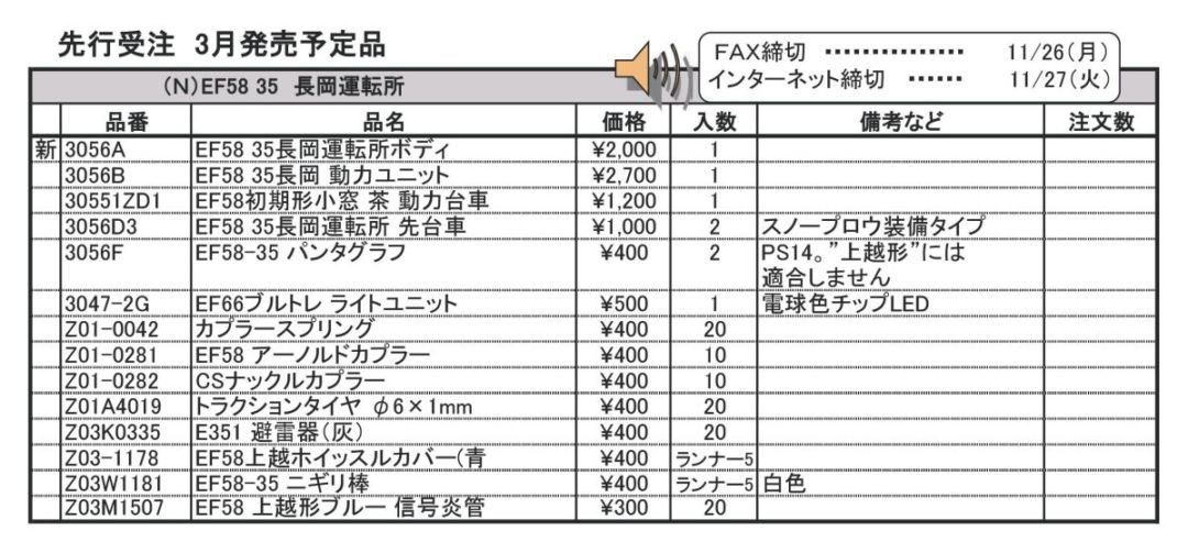 品番 品名 価格 入数 備考 [再] 3056A EF58 35長岡運転所ボディ 2000円 1 [再] 3056B EF58 35長岡 動力ユニット 2835円 1 クイックヘッドマーク用マグネット含みません [再] 30551ZD1 EF58小窓 茶色 動力台車 1260円 1 [再] 3056D3 EF58 35長岡運転所 先台車 1000円 2 スノープロウ装備タイプ [再] 3056F EF58-35 パンタグラフ 400円 2 PS14。”上越形”には適合しません [再] 3047-2G EF66ブルトレ ライトユニット 500円 1 電球色チップLED [再] Z01-0042 カプラースプリング 400円 20 [再] Z01-0281 EF58 アーノルドカプラー 400円 10 [再] Z01-0282 CSナックルカプラー 400円 10 共通部品 [再] Z01A4019 トラクションタイヤ φ6×1mm 400円 20 [再] Z03K0335 E351 避雷器(灰) 400円 20 [再] Z03-1178 EF58上越ホイッスルカバー(青 400円 ランナー5 [再] Z03W1181 EF58-35 ニギリ棒 400円 ランナー5 白色 [再] Z03M1507 EF58 上越形ブルー 信号炎管 300円 20 - クリックでオープン&クローズ