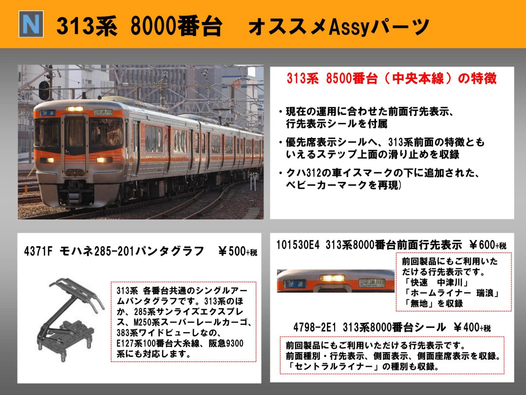 品番 品名 価格 入数 備考 [新] 4798-2A クハ312-8004 ボディ 1800円 1 [新] 4799-2A モハ313-8503 ボディ 1500円 1 [新] 4800-2A クモハ313-8503 ボディ 1800円 1 [新] 4799-1B モハ313-8503動力ユニット 2600円 1 [新] 4798-2C クハ312-8004 床下セット 1000円 1 ライトユニット付 [新] 4800-2C クモハ313-8503床下セット 1000円 1 ライトユニット付 [再] 4798-1D クハ312-8000 台車 400円 2 [再] 4800-1D クモハ313-8500 台車 450円 2 [再] 4799-1D1 モハ313-8500 動力台車 700円 1 トラクションタイヤ無 [新] 4798-2E1 313系8000番台 シール 400円 1 [新] 101530E4 313系8000番台前面行先表示 600円 セット対応分 「快速中津川」「無地」「ホームライナー 瑞浪」 [再] 14306-1G 西武クハ5507 ライトユニット 600円 1 ヘッド/テール:電球色 [再] Z04M3673 スカート銀(313系8000番台 400円 10 [再] Z04M5428 前面ホロ銀(313系8000番台 300円 10 [再] Z04-5543 クハ312-8000 アンテナ 300円 4 - クリックでオープン&クローズ