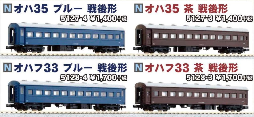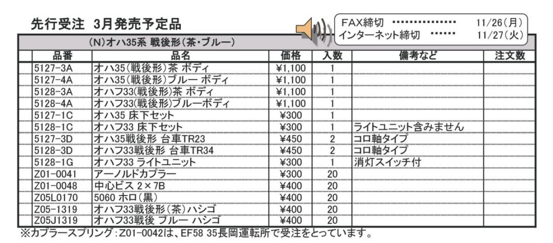 品番 品名 価格 入数 備考 [再] 5127-3A オハ35(戦後形)茶 ボディ 1 [再] 5127-4A オハ35(戦後形)ブルー ボディ 1 [再] 5128-3A オハフ33(戦後形)茶 ボディ 1 [再] 5128-4A オハフ33(戦後形)ブルーボディ 1100円 1 [再] 5127-1C オハ35 床下セット 300円 1 [再] 5128-1C オハフ33 床下セット 450円 1 ライトユニット含みません [再] 5127-3D オハ35戦後形 台車TR23 450円 2 アーノルドカプラー装備 [再] 5128-3D オハフ33戦後形 台車TR34 450円 2 アーノルドカプラー装備 [再] 5128-1G オハフ33 ライトユニット 300円 1 消灯スイッチ付 [再] Z01-0041 アーノルドカプラー 300円 20 [再] Z01-0048 中心ビス 2×7B 400円 20 [再] Z05L0170 5060 ホロ(黒) 400円 20 [再] Z05-1319 オハフ33戦後形(茶)ハシゴ 400円 20 [再] Z05J1319 ナハフ11かもめナックルカプラー 600円 10