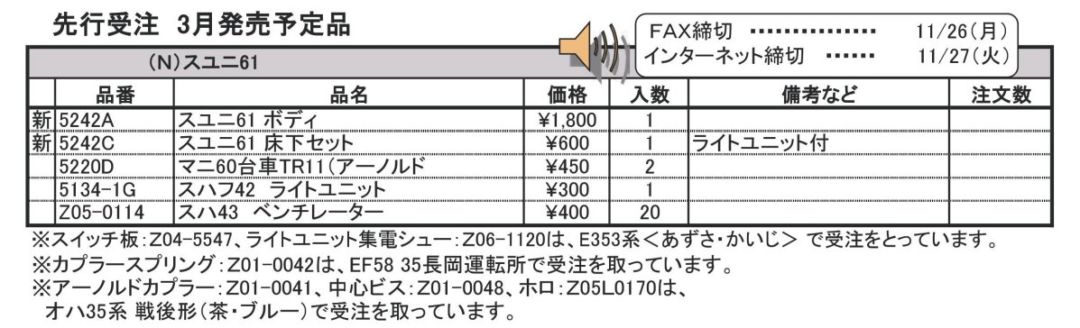 品番 品名 価格 入数 備考 [新] 5242A スユニ61 ボディ 1800円 1 [新] 5242C スユニ61 床下セット 600円 1 ライトユニット付 [再] 5220D マニ60台車TR11(アーノルド 450円 2 [再] 5134-1G スハフ42 ライトユニット 300円 1 赤色チップLED [再] Z05-0114 スハ43 ベンチレーター 400円 20 - クリックでオープン&クローズ