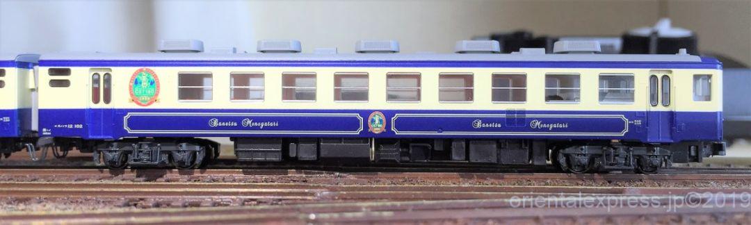 平成19年(2007)春にリニューアル工事を行い、客車装飾をオリエント急行をイメージした「濃い青」に変更した、12系客車です。