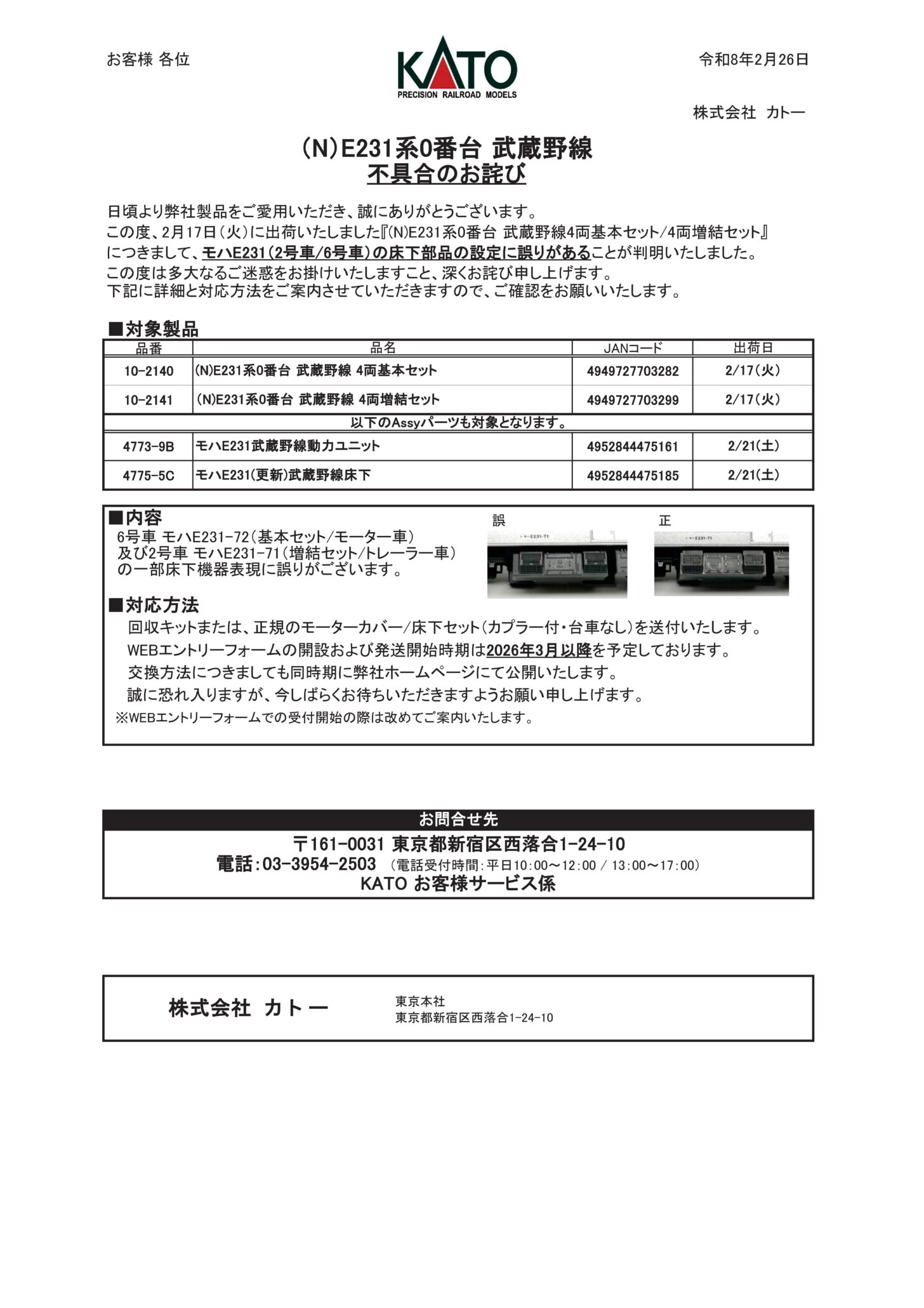 2月17日(火)に出荷いたしました『(N)E231系0番台 武蔵野線4両基本セット/4両増結セット』につきまして、モハE231(2号車/6号車)の床下部品の設定に誤りがあることが判明いたしました。