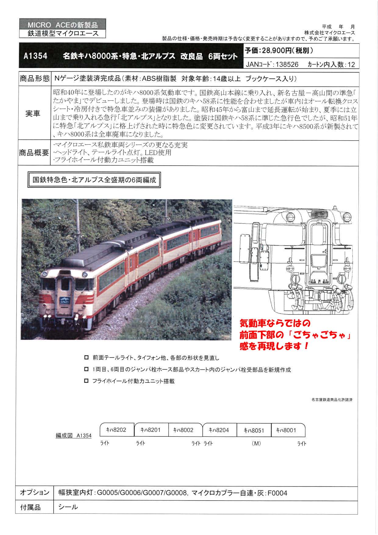 | [新]M | A1354 | 名鉄キハ8000系・特急・北アルプス 改良品 6両セット | 28,900円+税 |