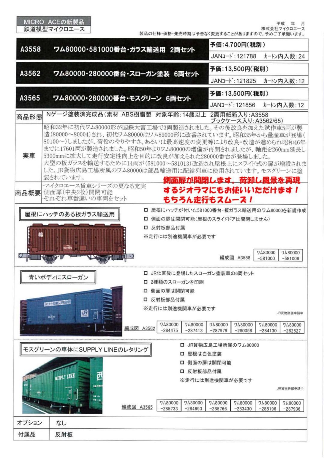 大型の板ガラスを輸送するために14両が(581000~581013)改造され屋根上にスライド式の扉が増設されました。JR貨物広島工場所属のワム80000は部品輸送用に配給列車に使用されています。モスグリーンに塗装されています。商品概要