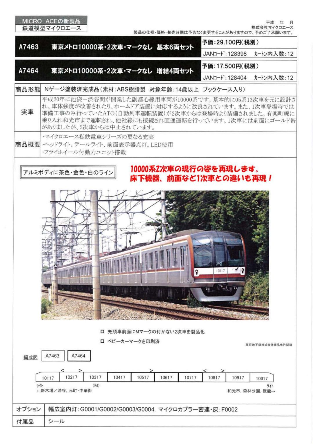 | [新]M | A7464 | 東京メトロ10000系・2次車・マークなし 増結4両セット | 17,500円+税 |
