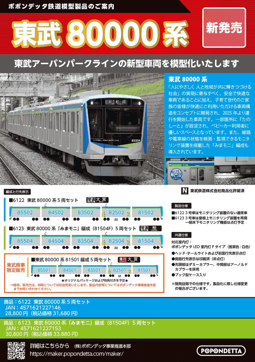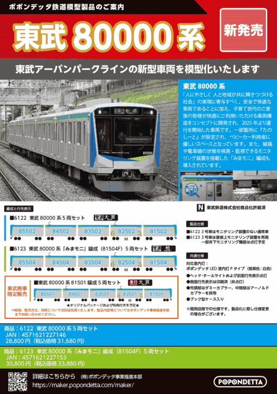 | 新 | 6124p | ポポンデッタ限定 東武80000系「みまモニ」予備編成(81505F)5両セット | 31,680円(税込) |