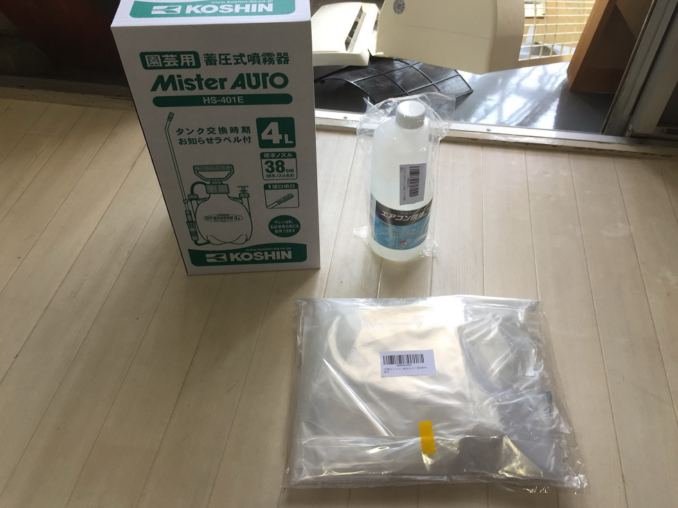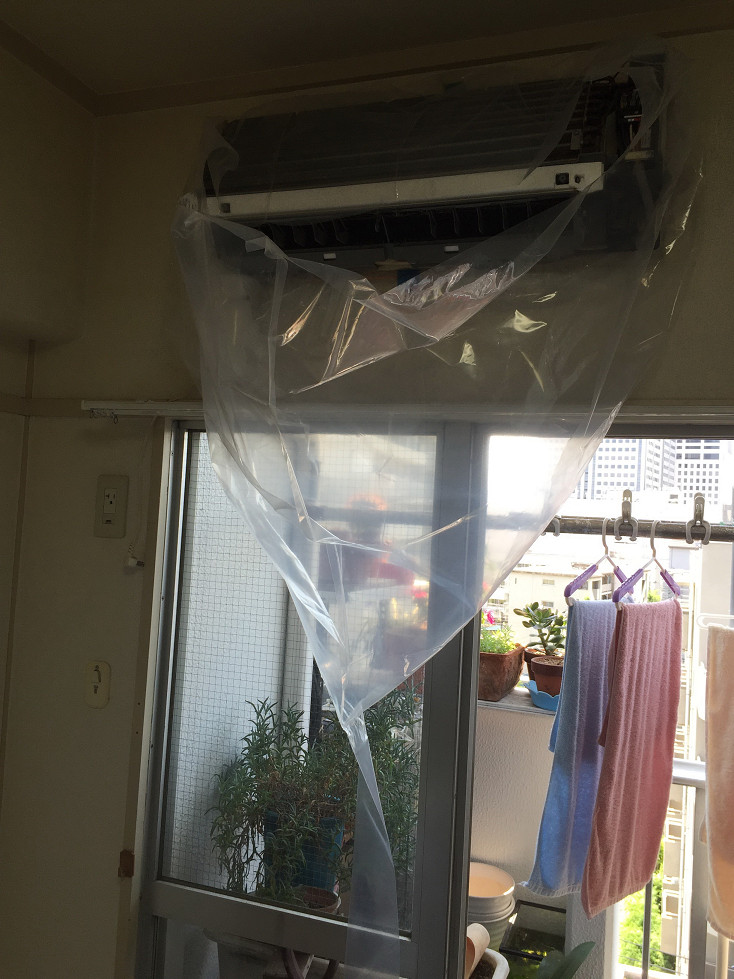 エアコン洗浄カバーを取り付けます。これは便利でした。壁も汚さずに床も汚さずにできます。