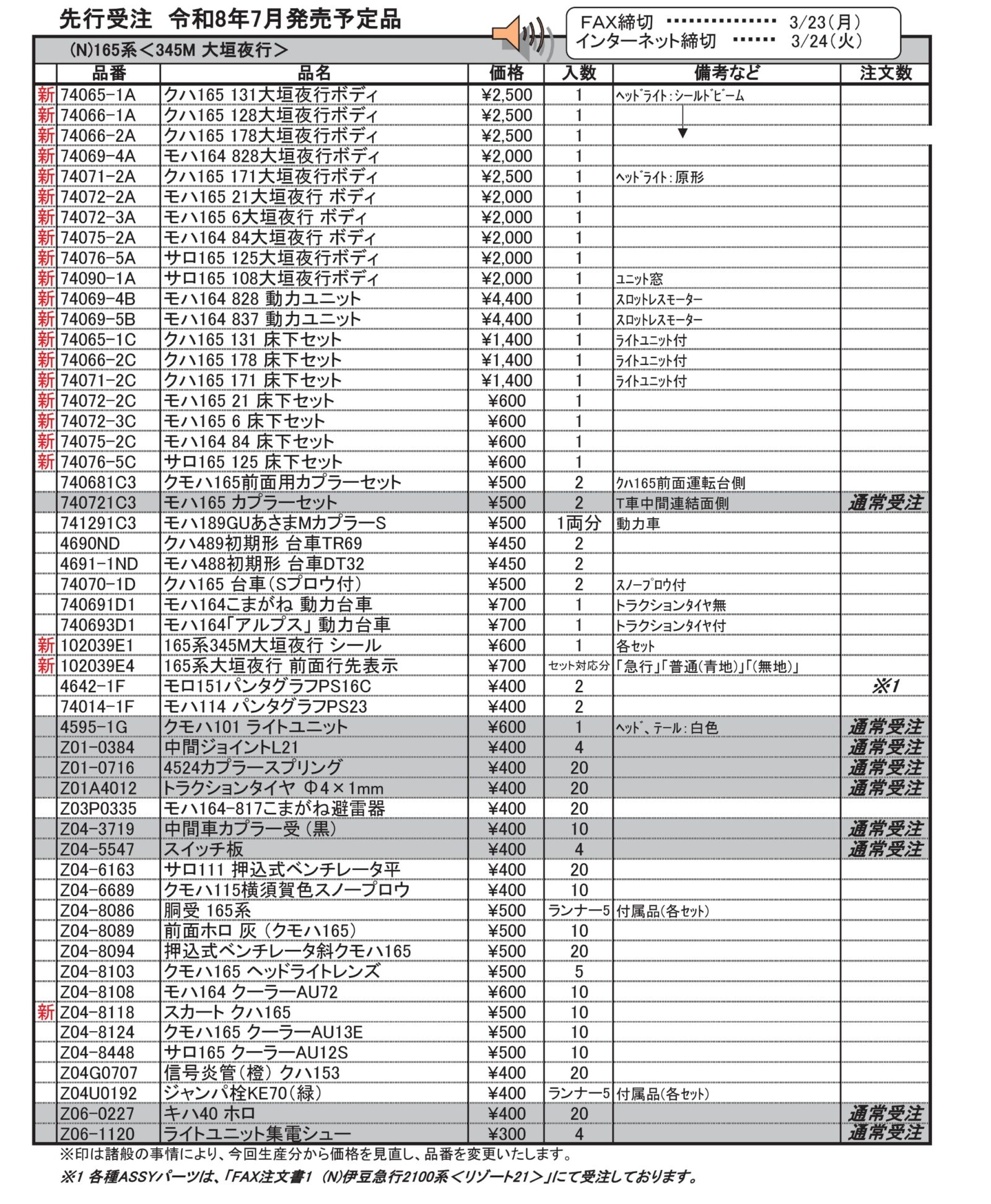 165系<345M 大垣夜行> 8両基本セット 2026年7月発売予定 品番:10-2039 鉄道模型 KATO(カトー)