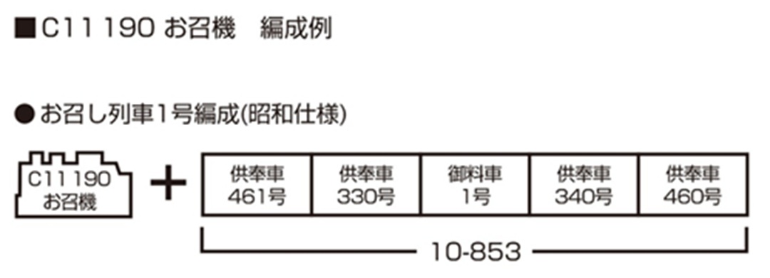◆緑色の色差しが入ったナンバープレートやロッドが特徴のC11 190号機を昭和41年(1966)のお召列車牽引時の仕様で製品化いたします。同時再生産予定の〈10-853 お召列車1号編成(昭和仕様)〉の牽引機としてはもちろんのこと、お召装飾の入ったきらびやかな外観はコレクションにもオススメです。