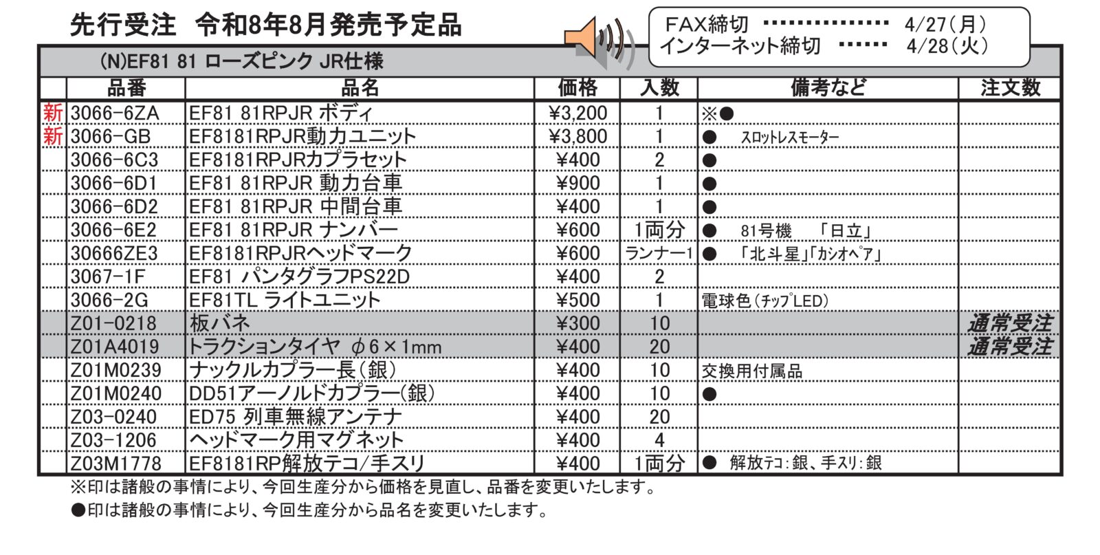 ⑨ナンバープレート:「EF81 81」、メーカーズプレート:「日立」、クイックヘッドマーク:「北斗星」「カシオペア」を付属 ※日章旗などのお召装備パーツは付属しません。
