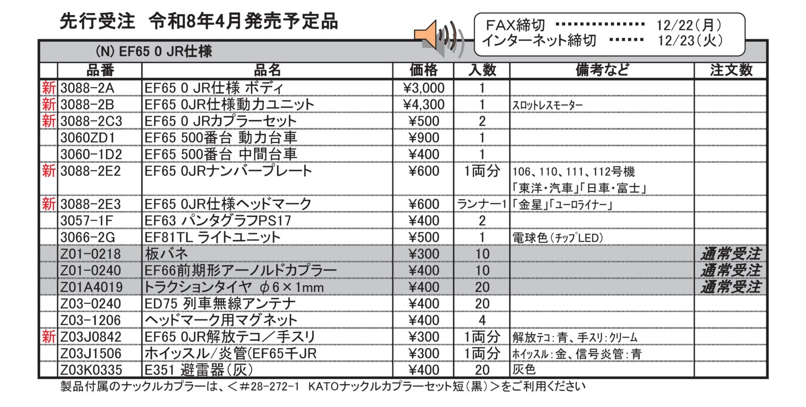 KATO(カトー)は完成品Nゲージ車両、EF65 0 JR仕様を販売。
