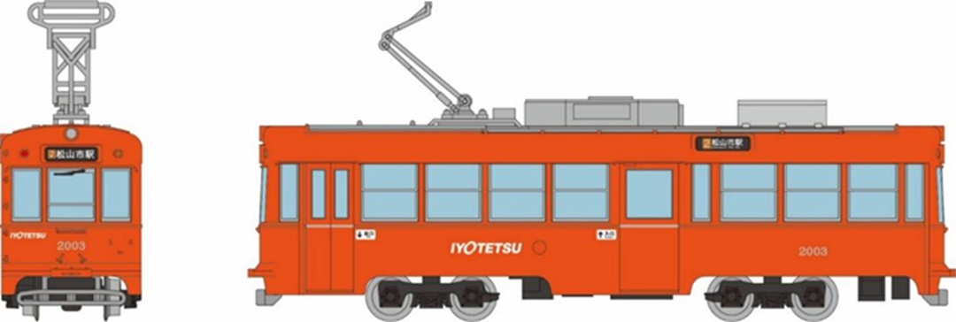 伊予鉄道は、松山市を中心に市内電車と郊外電車を運行する鉄道会社です。2000形は、京都市交通局2000形を譲り受け、1979年に運用を開始した車両です。5両が移籍し、現在も市内電車として活躍を続けています。2015年からは、「IYOTETSUチャレンジプロジェクト」の一環として外観デザインがー新され、オレンジー色のボディに新しいロゴを配したデザインとなりました。近年は、行先表示がLEDに更新され、英語表記にも対応しています。本製品では、LED行先表示に変更された、新塗装のモハ2003を再現いたします。