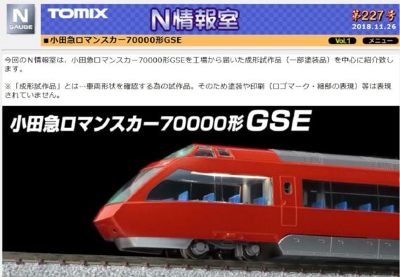 【TOMIX】N情報室更新 小田急ロマンスカー70000形GSE Vol.1 第227号掲載