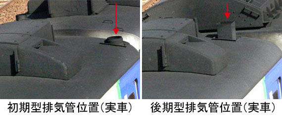 実車では、連結器周辺にあるジャンパ連結器(ジャンパ栓)の配置が、初めは片渡り構造のため連結向きが制限されましたが、その制限を無くすため後期は両渡り構造にした関係上ジャンパ連結器が追加され、その際車端床下から立ち上がる排気管の位置にも影響が出て、初期と後期にこのような違いが発生しました。