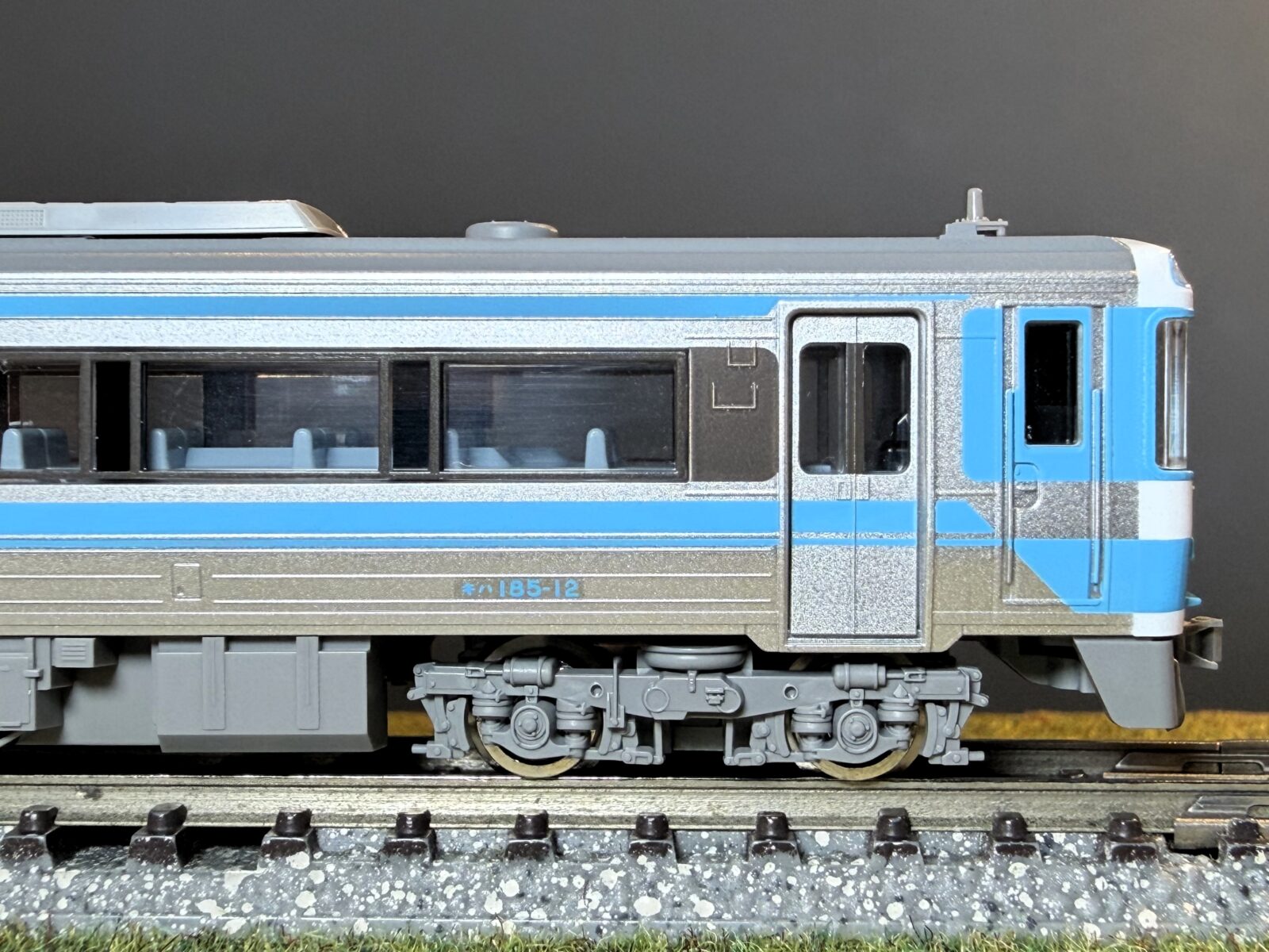 ・キハ185-12は元「アイランドエクスプレス四国Ⅱ」の側面ラッピングが施された姿を再現