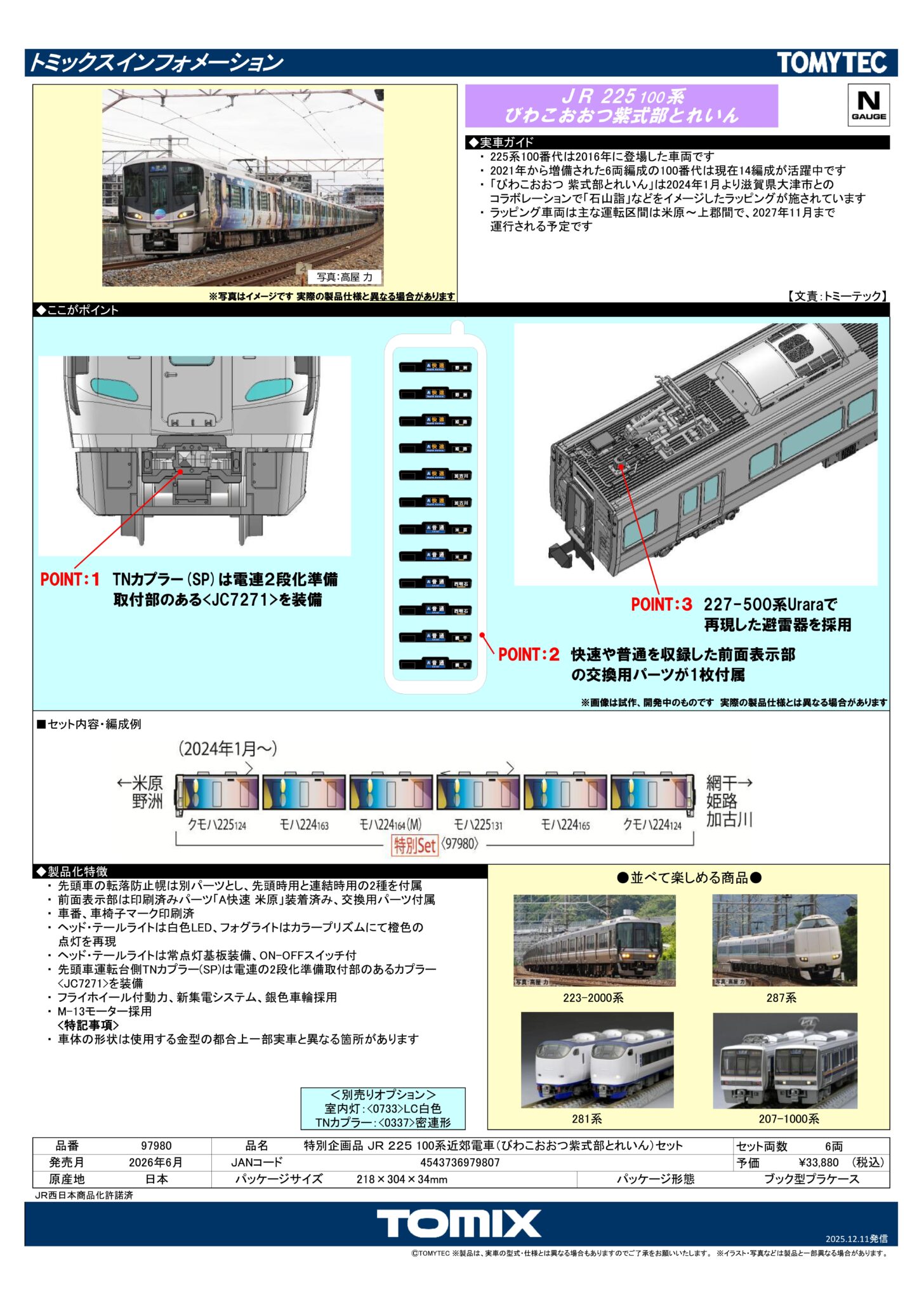 | 新 | 97980 | 特別企画品 JR 225 100系近郊電車(びわこおおつ紫式部とれいん)セット Amazon 楽天市場 Yahoo!ショッピング | 33,880円(税込) |